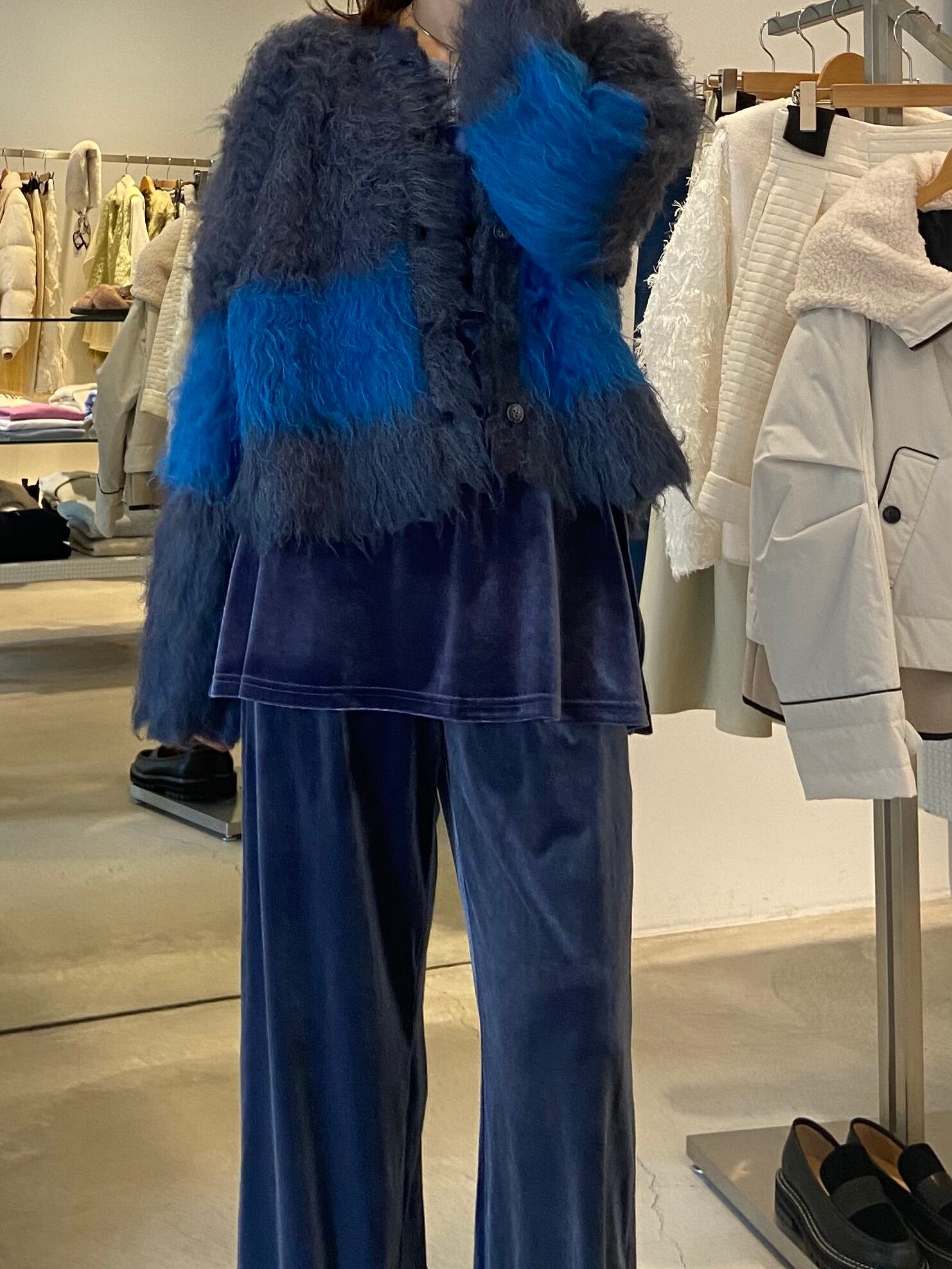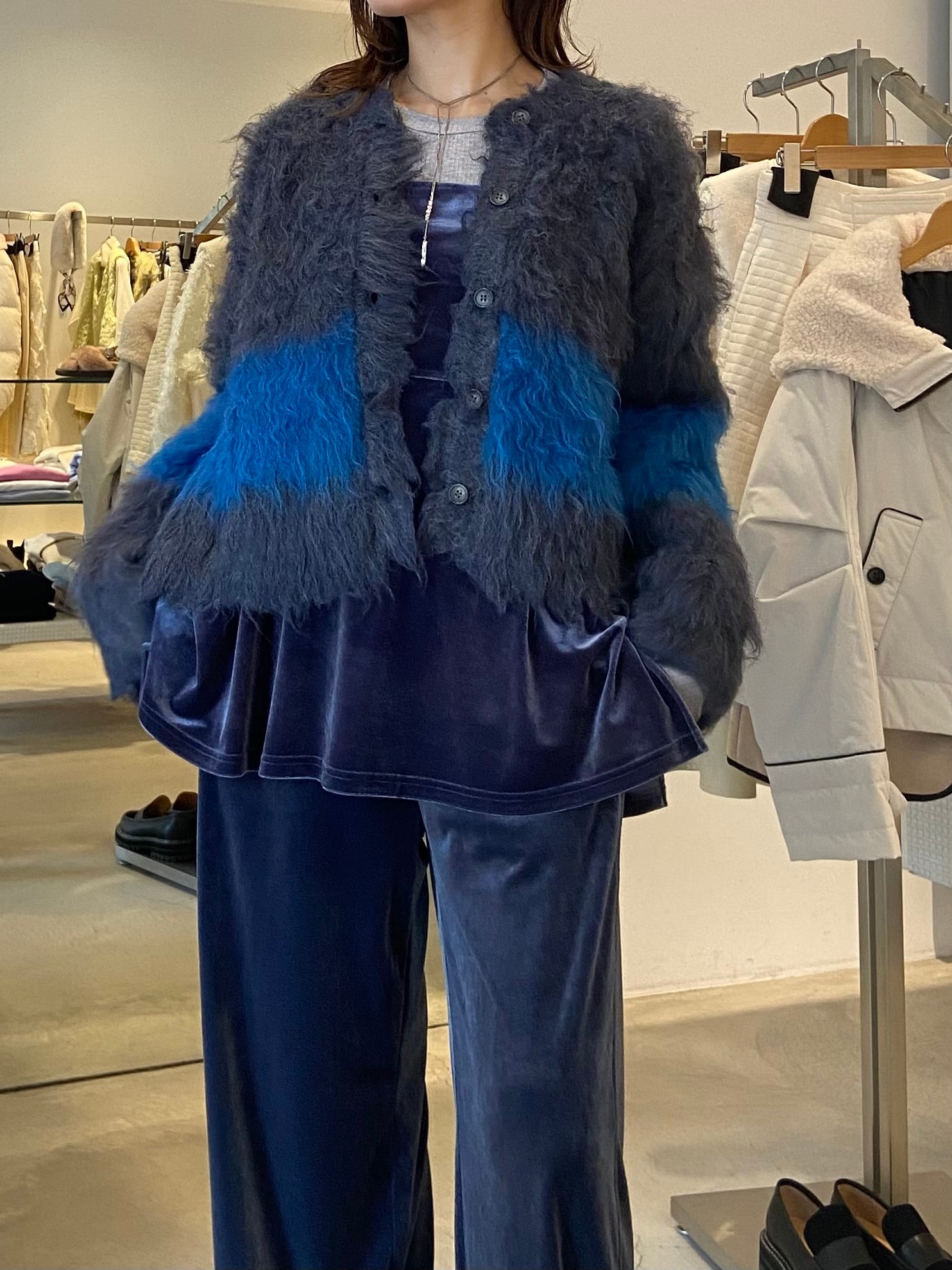 ブルーが際立つシャギーカーディガン。柔らかな素材感とふんわりとしたシルエットが優しく包み込んでくれます。